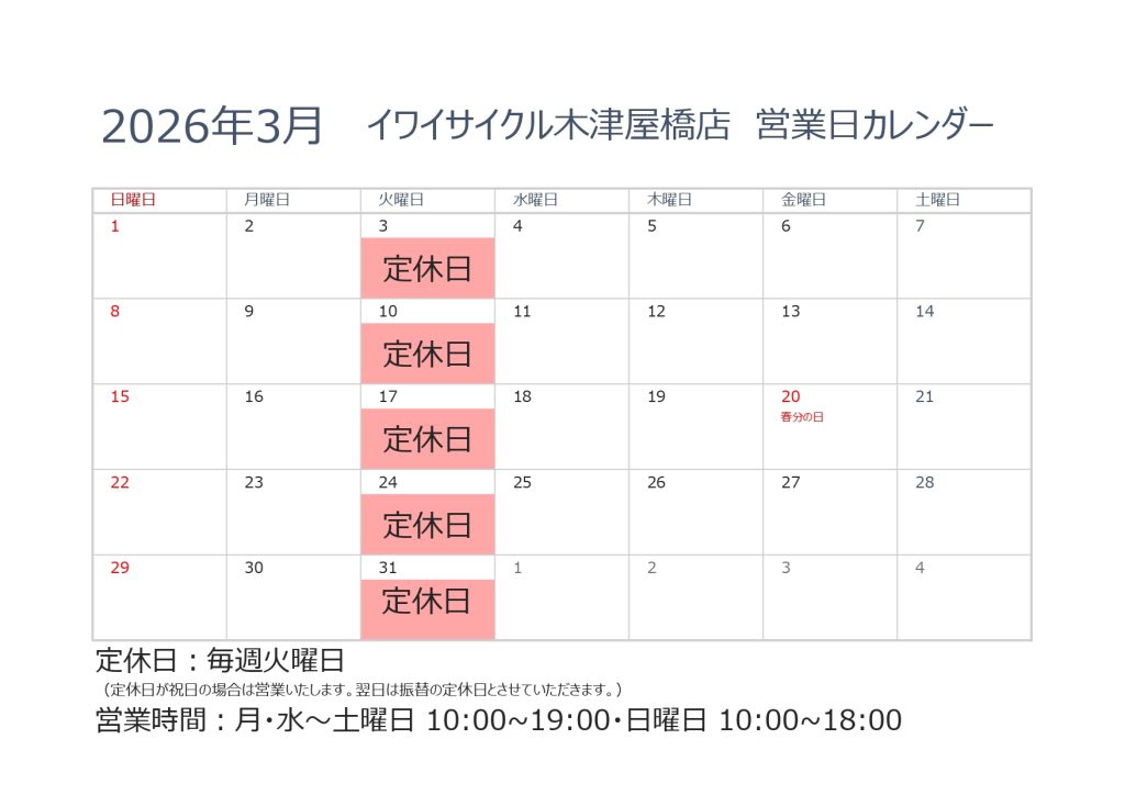 イワイサイクル木津屋橋店3月の営業日カレンダー