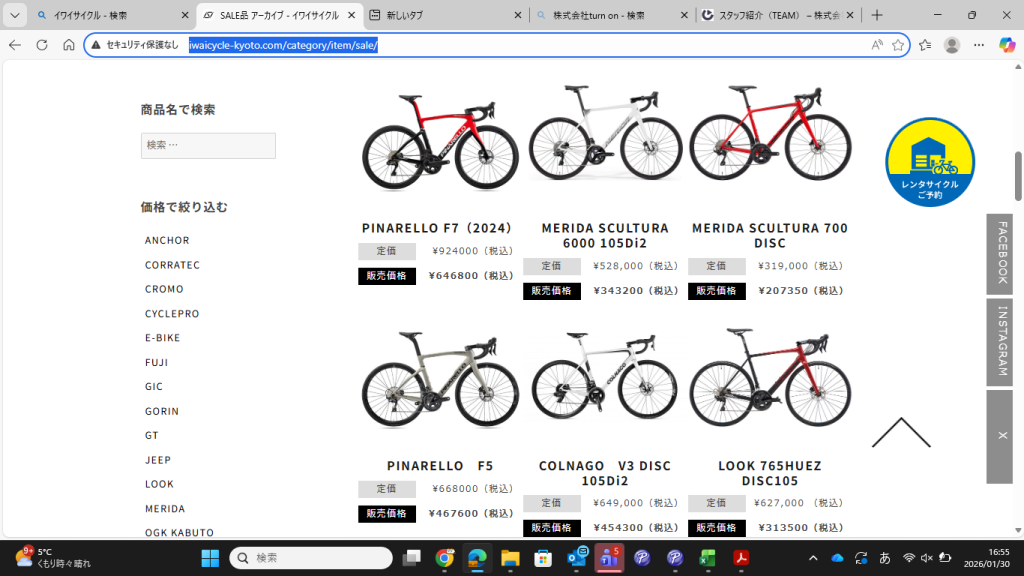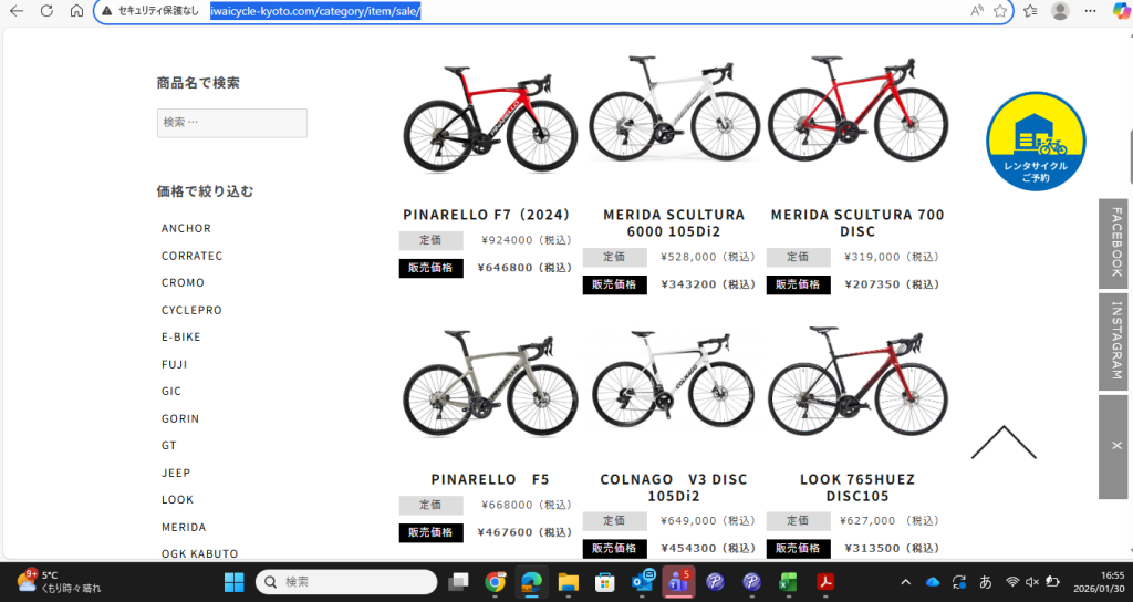 SALEアイテム更新しました 2026/01/30 PINARELLO、COLNAGO、LOOK、等の値下げSALE 30~50%オフ!!!! どのアイテムも1点物です 気になる方はこちらを→CLICK 関連商品 夏季休業のお知らせ 木津屋橋店7月・8月は休まず営業! 久世店臨時休業のお知らせ