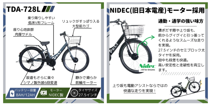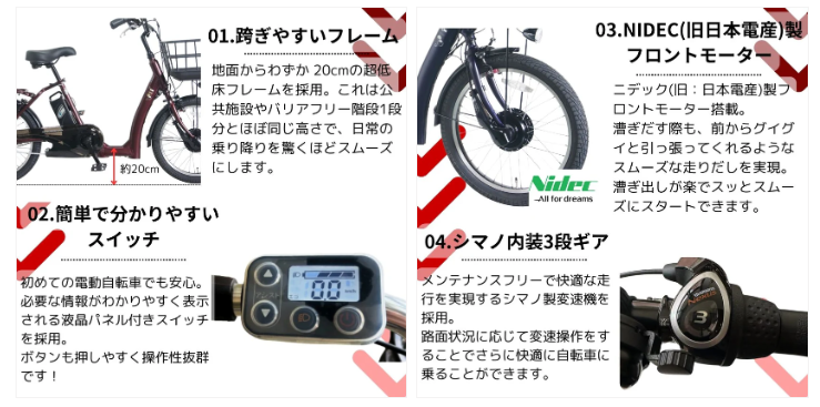 NIDEC(旧日本電産)製モーター、またぎやすい低床V型フレーム、大型前カゴ、リアキャリアなど